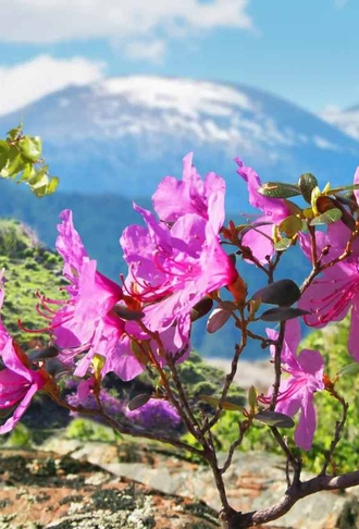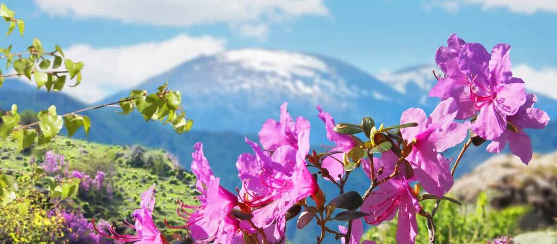 Маршрут проходит по живописным долинам и склонам, где маральник цветёт особенно обильно. Вас ждут прогулки по подготовленным тропам, остановки на лучших смотровых площадках и фототочках, где цветущие заросли сочетаются с горными реками, лесами и снежными вершинами. Вы сможете не только полюбоваться панорамами, но и подойти ближе к кустам, сделать фото «внутри» цветущего склона и запечатлеть горы в розовых тонах.
