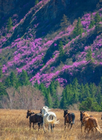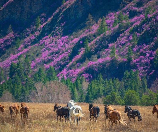алтайской сакурой". Зрелище получается по‑настоящему сказочным — розово‑фиолетовые склоны на фоне снежных вершин, бирюзовых рек и зелёных лугов создают ощущение, будто вы попали в другой мир.