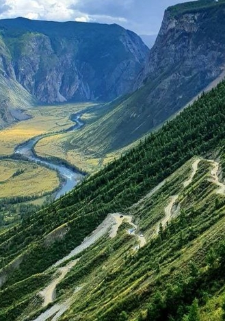 Сворачиваем в районе села Акташ с Чуйского тракта на Улаганский тракт. Легендарный перевал Кату-Ярык ведет нас прямо в Чулышманскую долину. Это удивительное древнее место силы, которое было недоступно для туристов до недавнего времени. Глядя с высоты, кажется, что время там внутри каньона течет вспять. Долина реки Чулышман — "дикая" сторона, одно из самых труднодоступных и самых красивых мест Алтая, туда невозможно проехать на легковом авто. Это место, общей протяженностью более 135 км, где без ложной скромности, действительно захватывает дух.